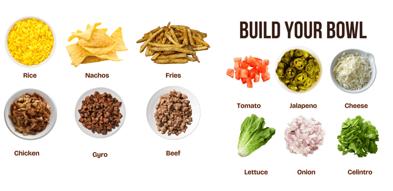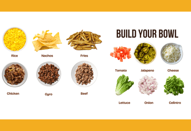Our menu features savory chicken, flavorful lamb gyro, and juicy ground beef, all served just the way you like it—with your choice of rice, nachos, or crispy fries. Customize your meal with a variety of fresh toppings to make it truly your own.