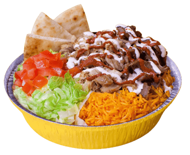 Basmati Rice is loaded with lamb gyro and your choice of favorite toppings and sauces.
